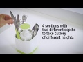 A cutlery drainer that ensures maximum capacity in minimum spaces. The Fill & Drain features 4 sections with two different depths to hold cutlery of different heights. The holes in the bottom of the drainer allow water to drain into the removable base, making it easy to empty and clean, even in the dish washer. With the base removed, it can be attached to the Flat & Drain plate/general drainer, forming a single unit for draining plates and cutlery.